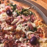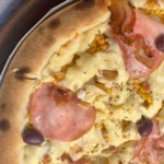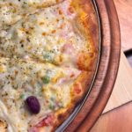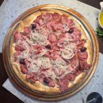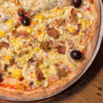 Frango desfiado, palmito, bacon, requeijão, lombo defumado, cebola e borda de requeijão