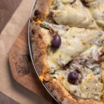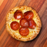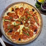 Pepperoni, mussarela, rodelas de pimentão e azeitonas picadas