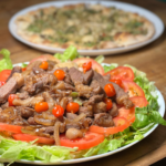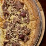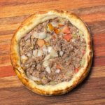 Mussarela, picanhas em tiras pré assadas na chapa e parmesão.