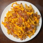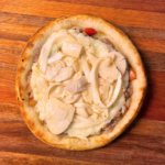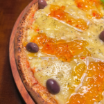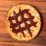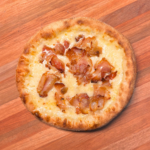 Molho de tomate, frango desfiado, cream cheese, bacon e molho barbecue