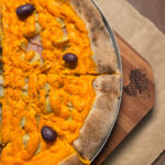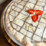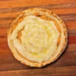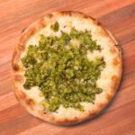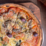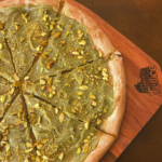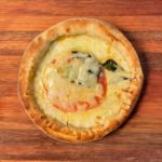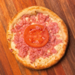 Presunto parma, bufalina, tomate cereja, mussarela e molho pesto com borda de gergelim
