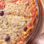 Atum especial produzido na casa, presunto, ervilhas, pimentão, cebola e mussarela