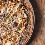 Atum especialmente preparado na casa, cream cheese, alho poró, pimenta dedo de moça, molho tarê e borda de gergelim preto torrado.